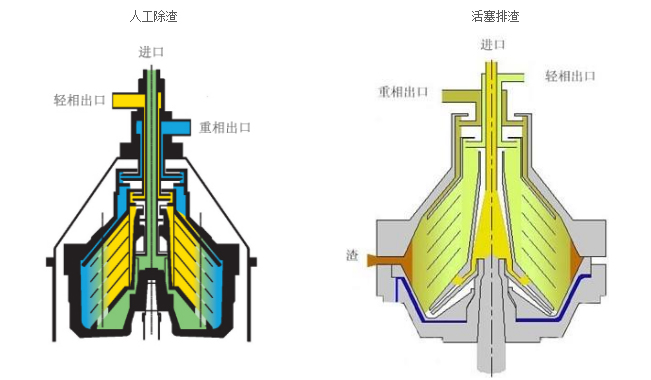 電機通過螺旋齒輪副驅動轉鼓繞主軸軸線做高速旋轉,在轉鼓內形成強大的離心力場。物料由上部中心進料管流入轉鼓底部,通過碟片分流孔趨向轉鼓壁空間。在離心力作用下,輕液沿錐形碟片外錐面向軸心流動至上部由輕液口排出。重液沿碟片內錐面趨向轉鼓壁流動至上部的重液口排出。比液相重的固相物沉積向轉鼓內壁形成沉渣,由排渣裝置自動排出機外或停機后由人工清除。